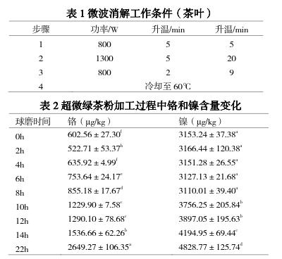 血[6];過量的鎳可引起炎癥、癌癥、癥、系統(tǒng)紊亂、降低生育能力、致畸和致突變等[7];鉻雖是人體必需的微量元素,但高鉻的食用也會引起不適[8]。超微綠茶粉是將達(dá)到綠色標(biāo)準(zhǔn)的綠茶茶葉,經(jīng)超微粉碎形成 200 目(74μm)甚至達(dá)到 1000 目(12μm)以上的綠茶超微細(xì)粉[9-10]?,F(xiàn)階段我國企業(yè)大多采用球磨方式加工超微綠茶粉,在球磨加工過程中,茶葉被粉碎的同時,研磨材料本身也會發(fā)生變化,從而可能給超微綠茶粉帶來重金屬污染。另外,與傳統(tǒng)茶葉不同的是,超微綠茶粉屬于茶葉深加工范疇,常被以全組分形式加入到食品和化妝品中[11],又因其中的重金屬元素應(yīng)滿足《食品標(biāo)準(zhǔn)食品中污染物限量》和《茶葉中鉻、鎘、汞、砷及氟化物限量》對茶葉中重金屬限量要求[12-13],因此應(yīng)對超微綠茶粉加工過程中重金屬污染給予關(guān)注,但目前對超微綠茶粉加工過程中的重金屬含量變化未見報道。本文對球磨加工過程中超微綠茶粉的重金屬含量進(jìn)行檢測分析,同時,采用三組球磨材料不銹鋼球-不銹鋼罐、氧化鋯球-不銹鋼罐、瑪瑙球-尼龍罐對超微綠茶粉進(jìn)行加工,通過重金屬元素鉻和鎳的檢測,并結(jié)合粒徑分析,為尋找合適的球磨材料提供依據(jù)。